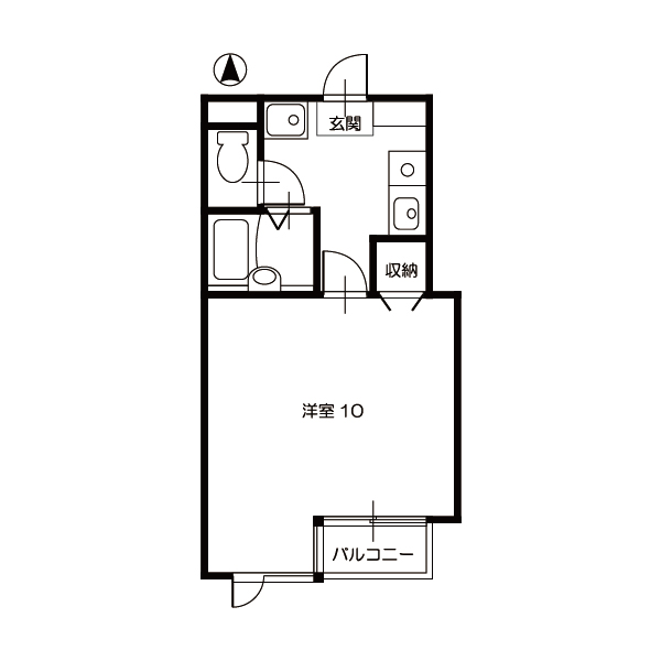お部屋は9帖と広めの洋室で、バストイレ別、ガスコンロ付きのキッチン、室内洗濯機置き場があります。